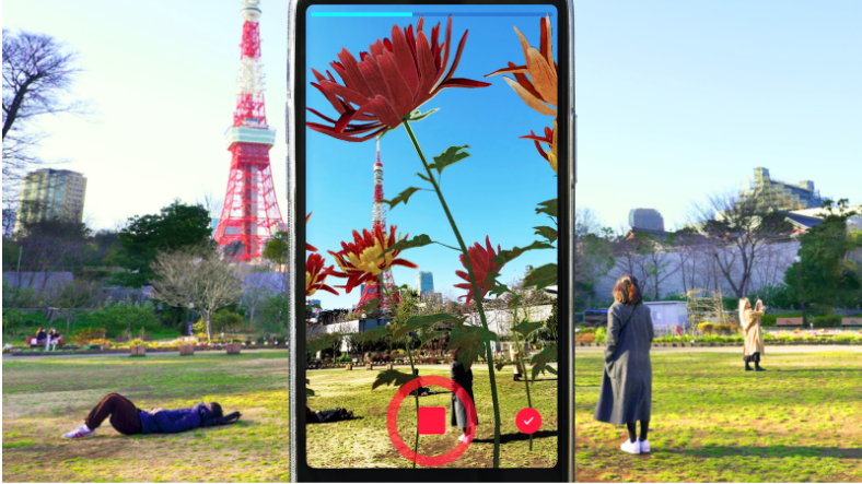 ショートムービープラットフォーム「TikTok」アプリのカメラ越しに見えている世界に、リアルタイムに実空間の環境に影響を受けた花々が生まれる。
